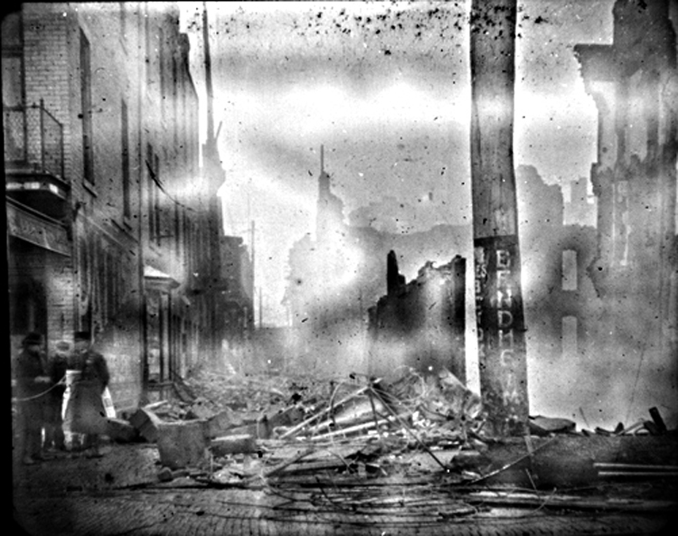 This slide in the next two following it are not the greatest pictures. They cleaned up a little but they are flawed pictures. Magic Lantern #75. 1905 Diamond Fire. Big fire which destroyed the Diamond, Fifth Street and Market Street. While dynamiting the Ikirt Building a loose brick was blown across the street in front of the Brooks Building and killed a man by the name of Moore.